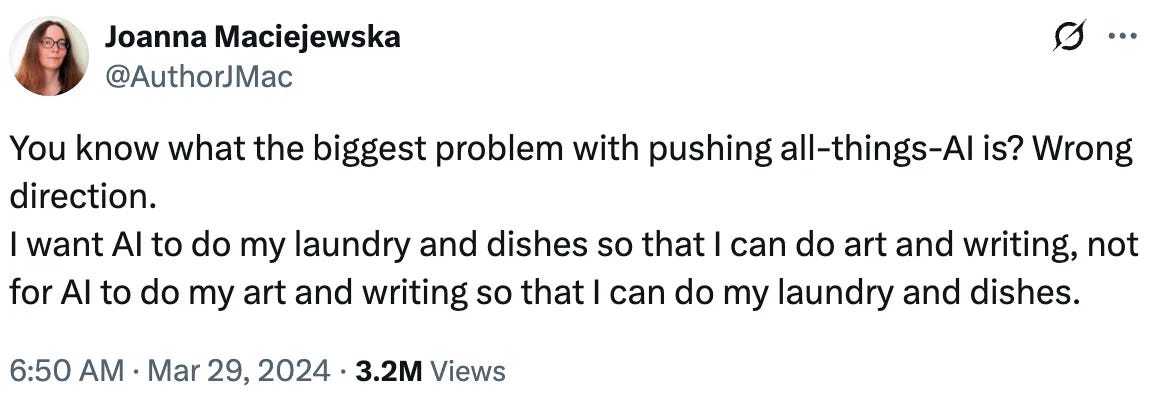 Take AI, for example. Artists, writers, creators: in general, we are not fans of AI, specifically when it steals from our already created content without our approval, or steals a job from us because it’s more efficient and (let’s be real) cheaper. But the prevailing sentiment from many artists I’ve encountered can best be summed up via tweet from fantasy author, Joanna Maciejewska:
