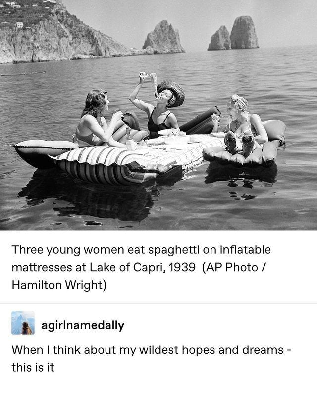 🍝I want this photo of women eating spaghetti afloat Lake Capri framed. Also please take of the comment below the caption…