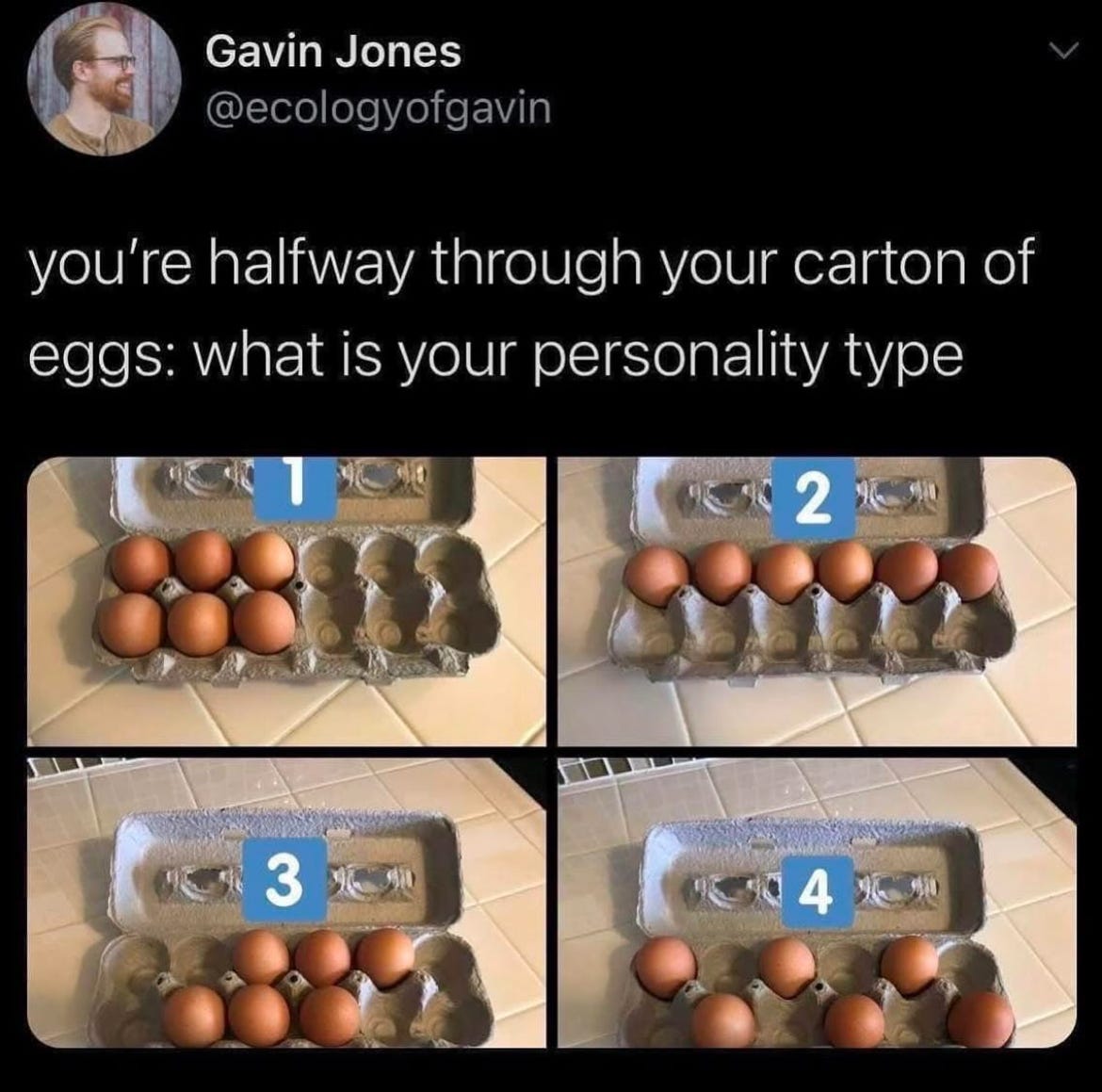 I'm a 3, sometimes 4, on the eggs. My mother was adamant you couldn't put all the eggs on one side of the carton.